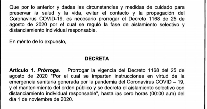 Sin embargo, el día de ayer, la rúbrica del Decreto 1297 se estableció prorrogar la vigencia del Mandato 1168 hasta las 00:00 del 01 de noviembre del 2020, considerando todas las restricciones y medidas previamente establecidas.