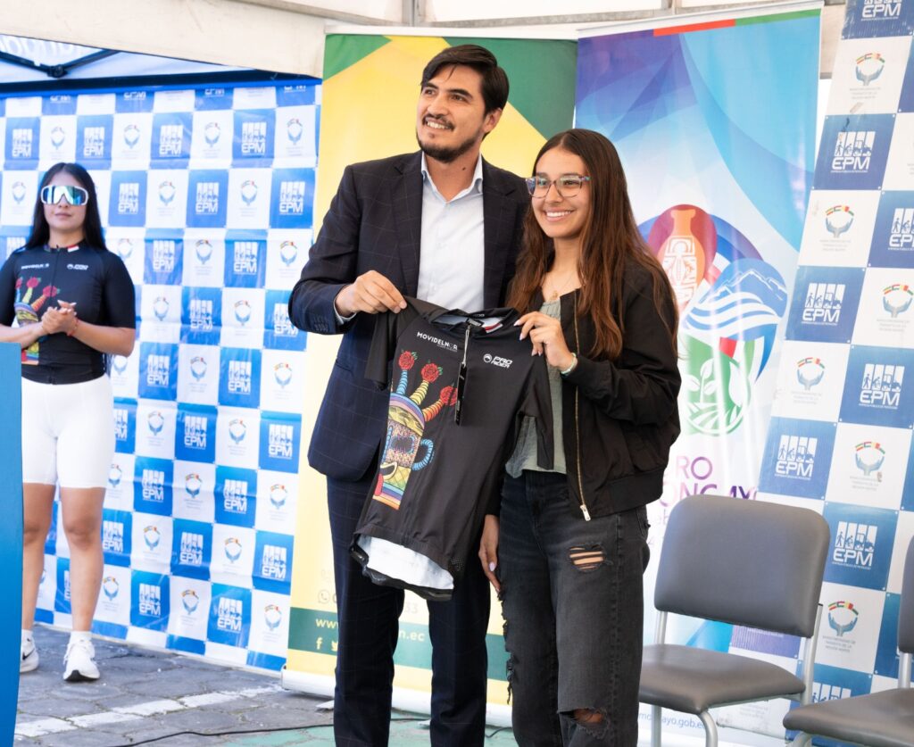 Michael Jiménez, gerente general de Movidelnor entrega el jersey oficial a Natalia Vásquez, campeona nacional de élite ruta