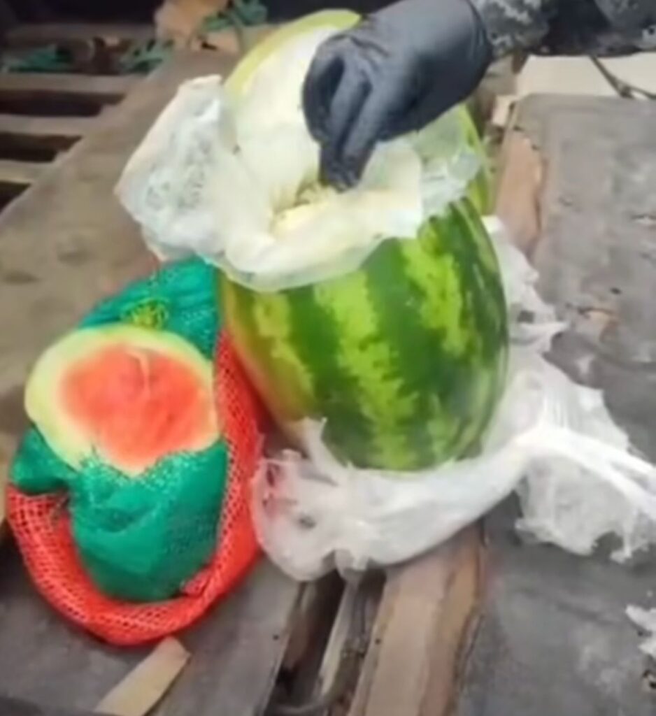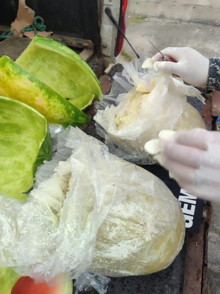 Mediante técnicas de observación y perfilamiento, se detuvo la marcha de una camioneta, al realizar el registro a los ocupantes, se encontraron entre las pertenencias de uno de ellos, sustancias sujetas a fiscalización ocultas en el interior de dos sandías.