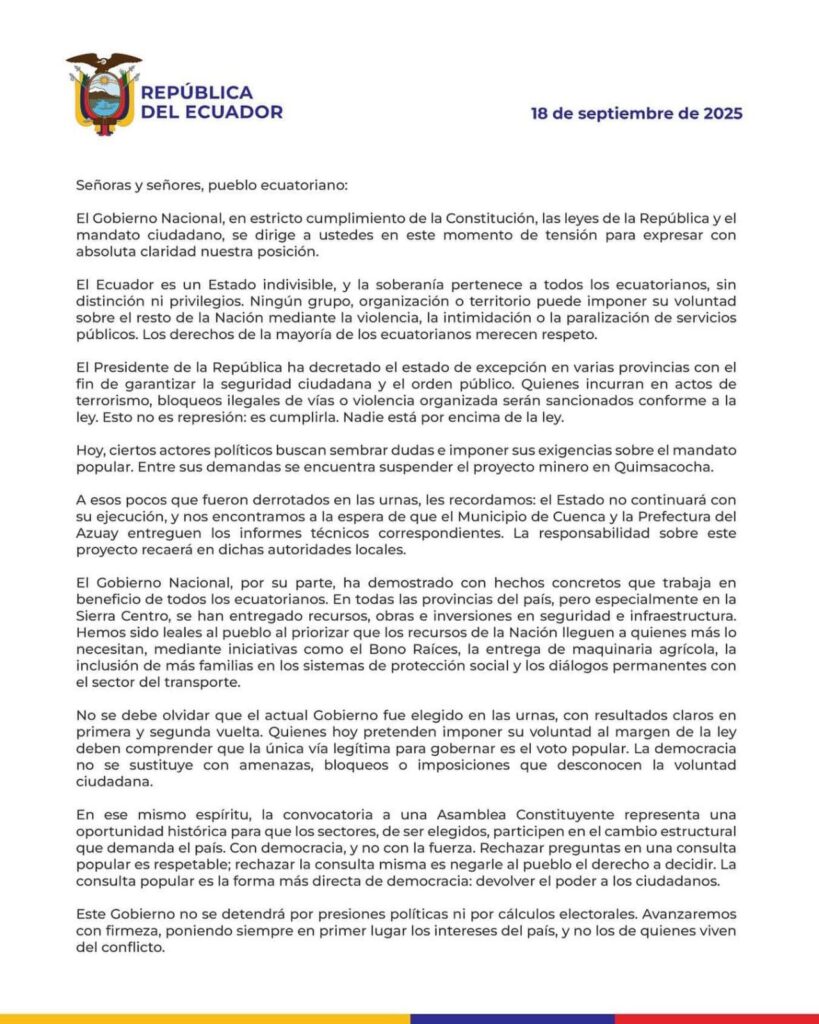 El Ecuador es un Estado indivisible, y la soberanía pertenece a todos los ecuatorianos, sin distinción ni privilegios. Ningún grupo, organización o territorio puede imponer su voluntad sobre el resto de la Nación mediante la violencia, la intimidación o la paralización de servicios públicos. Los derechos de la mayoría de los ecuatorianos merecen respeto.